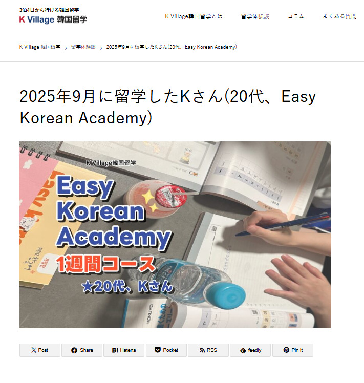 K Village様が主催する「韓国短期留学プログラム」に参加した本学学生の留学体験談が、