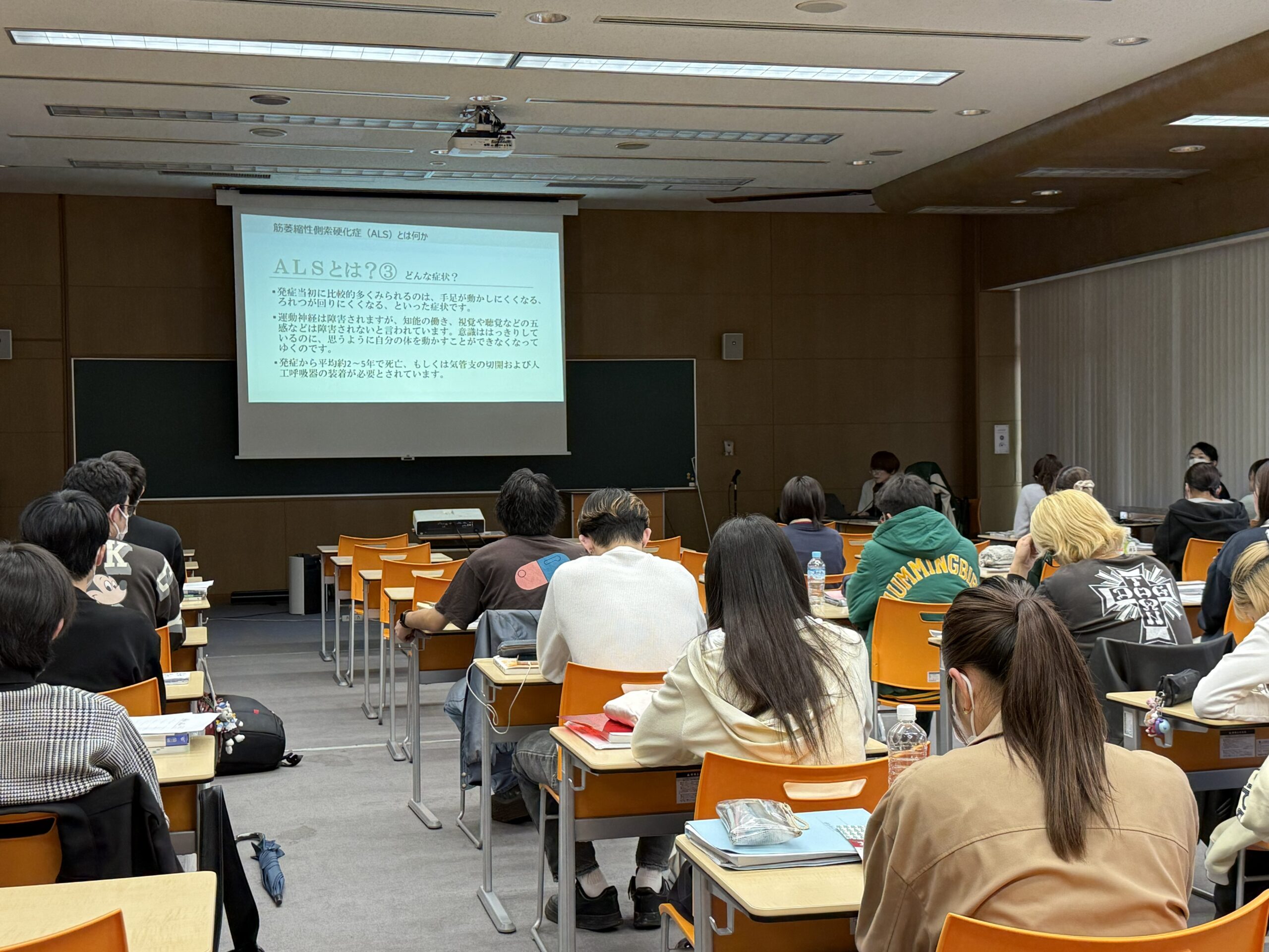 講義では、ALS患者として直面する困難や心情などを率直にお話しいただきました。学生たちは、これまで知る機会の少なかった当事者の生の声に触れることで、身体がどんなに不自由になっても、その人らしく地域で暮らせるしくみ作りの重要性、ひいては社会の理解促進がいかに大切かを学びました。